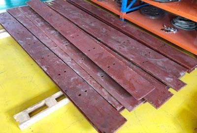 (2)利用撬杠等等工具,拆卸挡圈及锁圈然后检查轮胎衬垫与轮辋外表面是否粘连(轮胎使用时间较长,衬垫与轮辋外表面可发生粘连)。若发生可撤掉支撑物,使机器在短距离内慢速往复运行,直至衬垫与轮辋外表面脱离;严禁转向和高速行驶,以免损坏内胎。然后,前轮重新支撑起来。